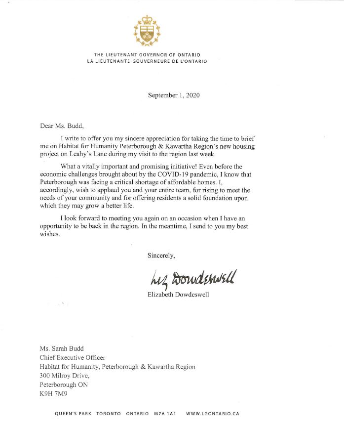 Recently, our CEO, Sarah Budd, had a special opportunity to visit with The Lieutenant Governor of Ontario, Elizabeth Dowdeswell, and discuss Habitat for Humanity Peterborough & Kawartha Region’s exciting new multi-residential development Leahy’s Lane.