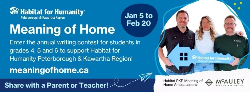 At Habitat for Humanity Peterborough & Kawartha Region, we believe that a home is so much more than just a place to live. Home is safety, stability, belonging, and a foundation for the future. That’s why we are proud to help bring the Meaning of Home Contest to classrooms and families across our region once again this year.